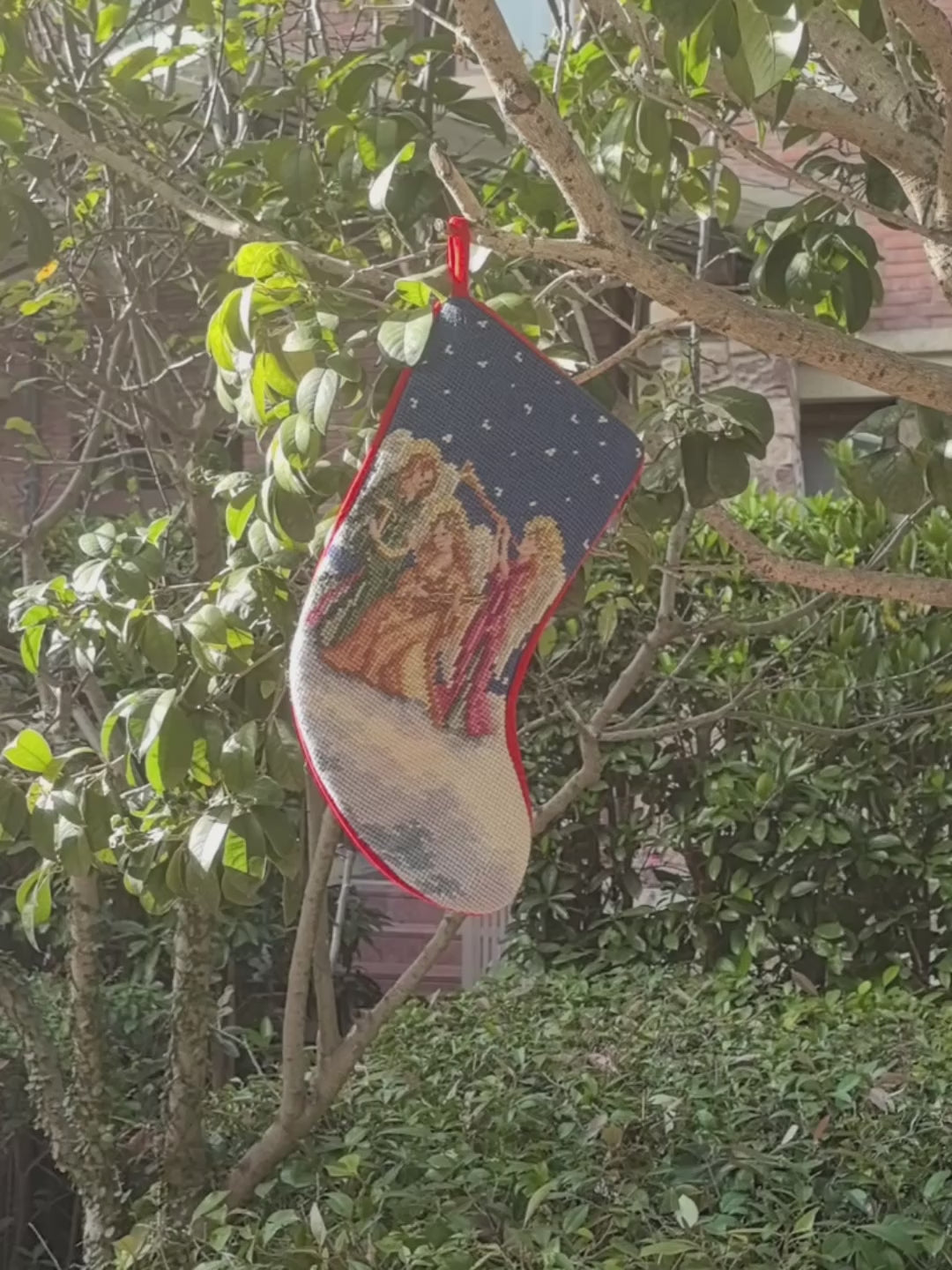 100% Wool Hand-Embroidered Christmas Stocking, 12 x 6 in – Small Handmade Needlepoint Holiday Decoration with Classic Festive Scene