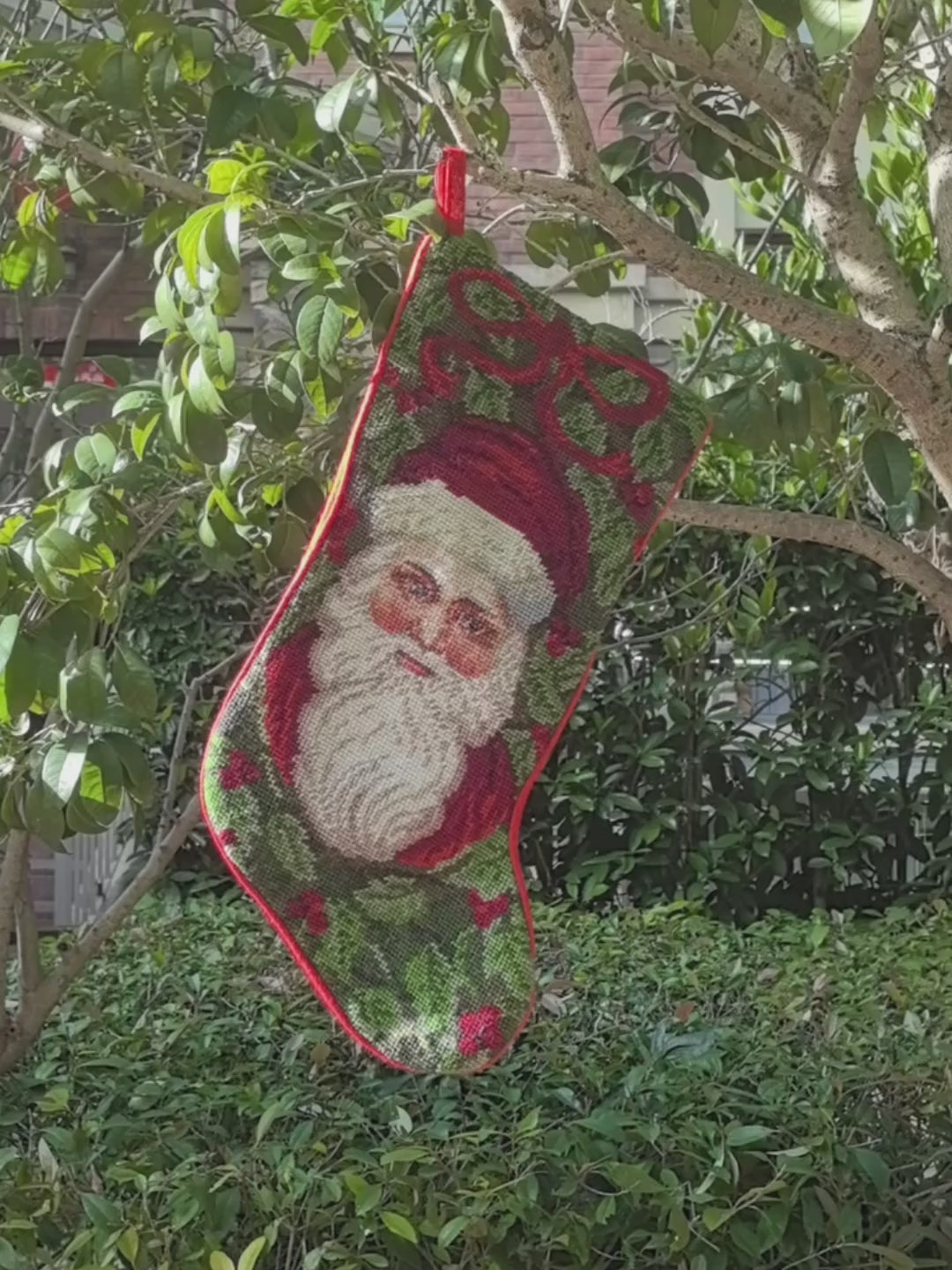 Hand-Embroidered Christmas Stocking, 16 x 8 in – 100% Wool Needlepoint Holiday Decoration with Classic Santa Design